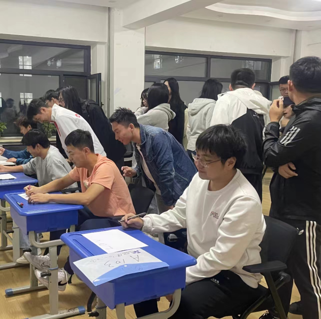 随后,“字母传递“环节进一步调动起同学们的热情和积极性。本环节将同学们分为4组纵列,主持人向四名列尾同学介绍“LOVE”“LUCK””HOME””COME”,列尾同学向前一名同学后背书写,并依次传递到列首同学。此环节培养了同学们的合作精神,也增强了同学之间的默契。