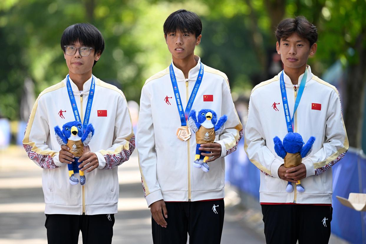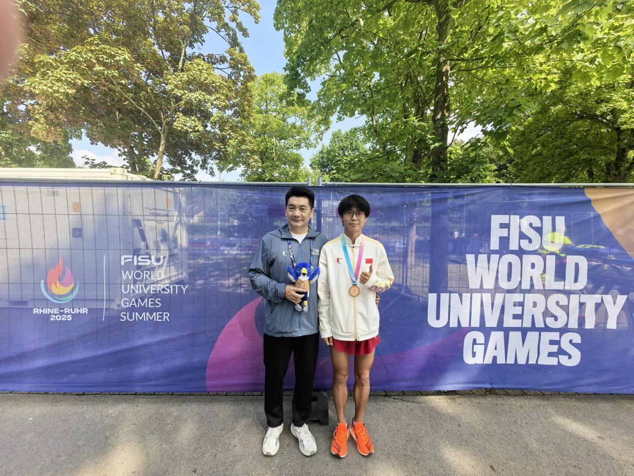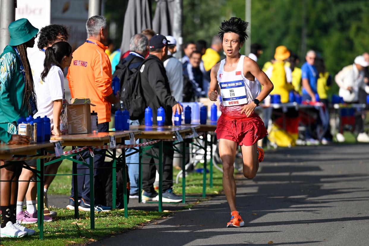 学生马瑞在男子半程马拉松赛场续写精彩。这是他第二次站上世界大学生运动会舞台。此次德国之行,他不仅与队友携手拿下团体铜牌,个人表现更是实现显著突破:完赛成绩1:04:26,较上届的1:06:11大幅提升。