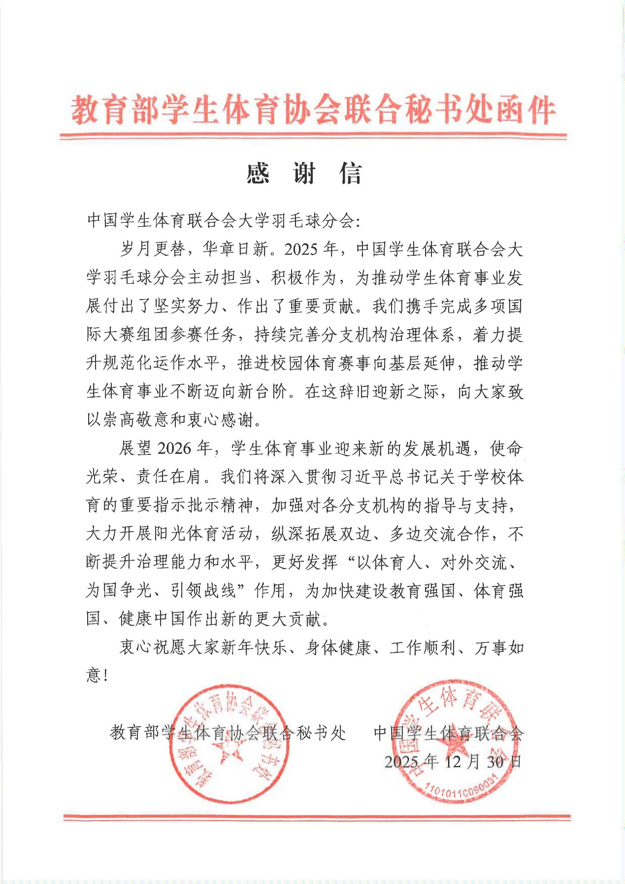 信中提到:“在2025年,中国学生体育联合会大学羽毛球分会携手完成多项国际大赛的组团参赛任务,持续完善分支机构治理体系,着力提升规范化运作水平,推动学生体育事业不断迈向新台阶。”这一成就彰显了141JAV