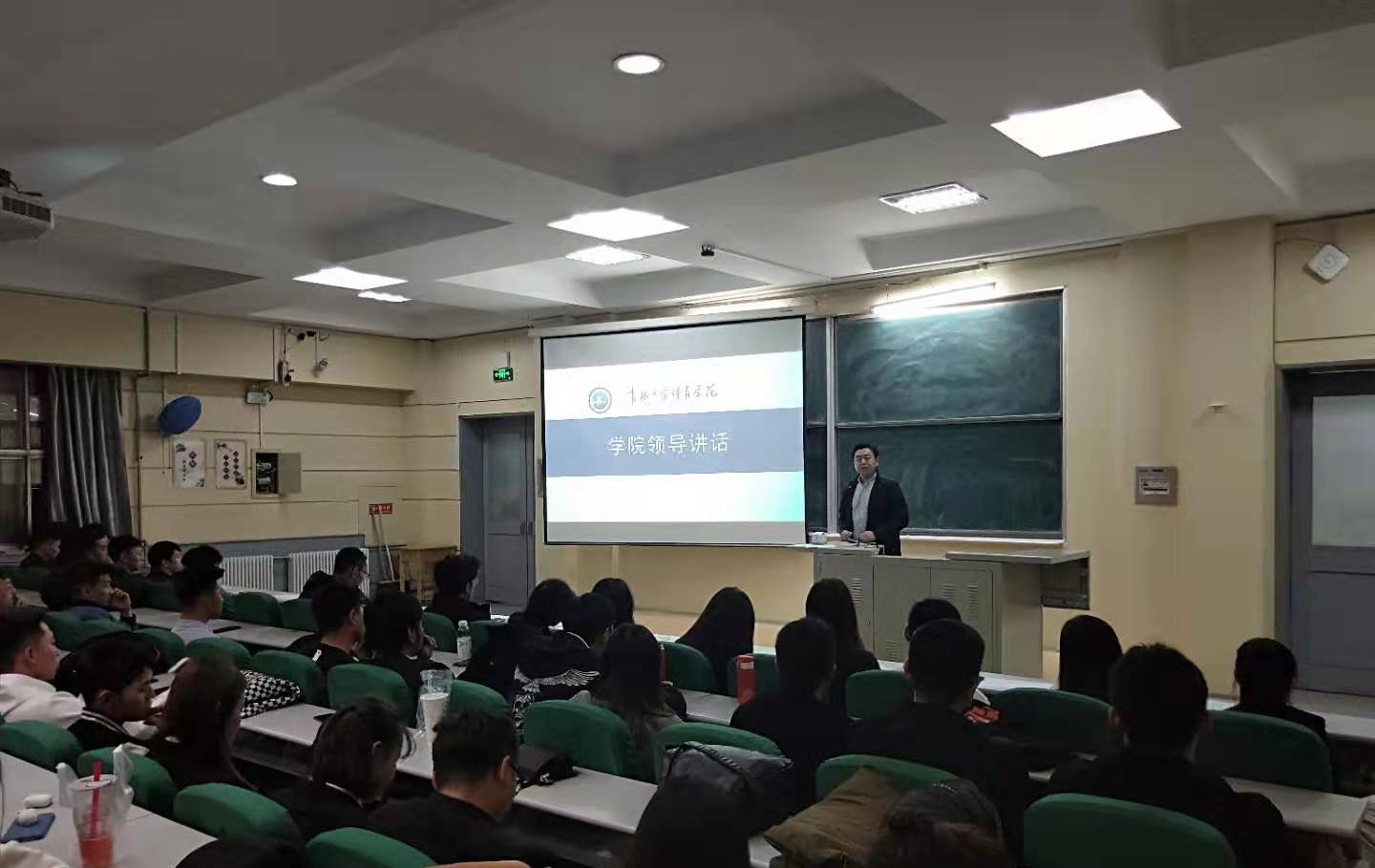 在逸夫楼第二阶梯教室召开2019年团学组织换届大会。学院党委副书记兼副院长田进、辅导员宫勖能、博士兼职辅导员魏铭泽、全体团学组织干部及全年级各班班委参加此次大会。