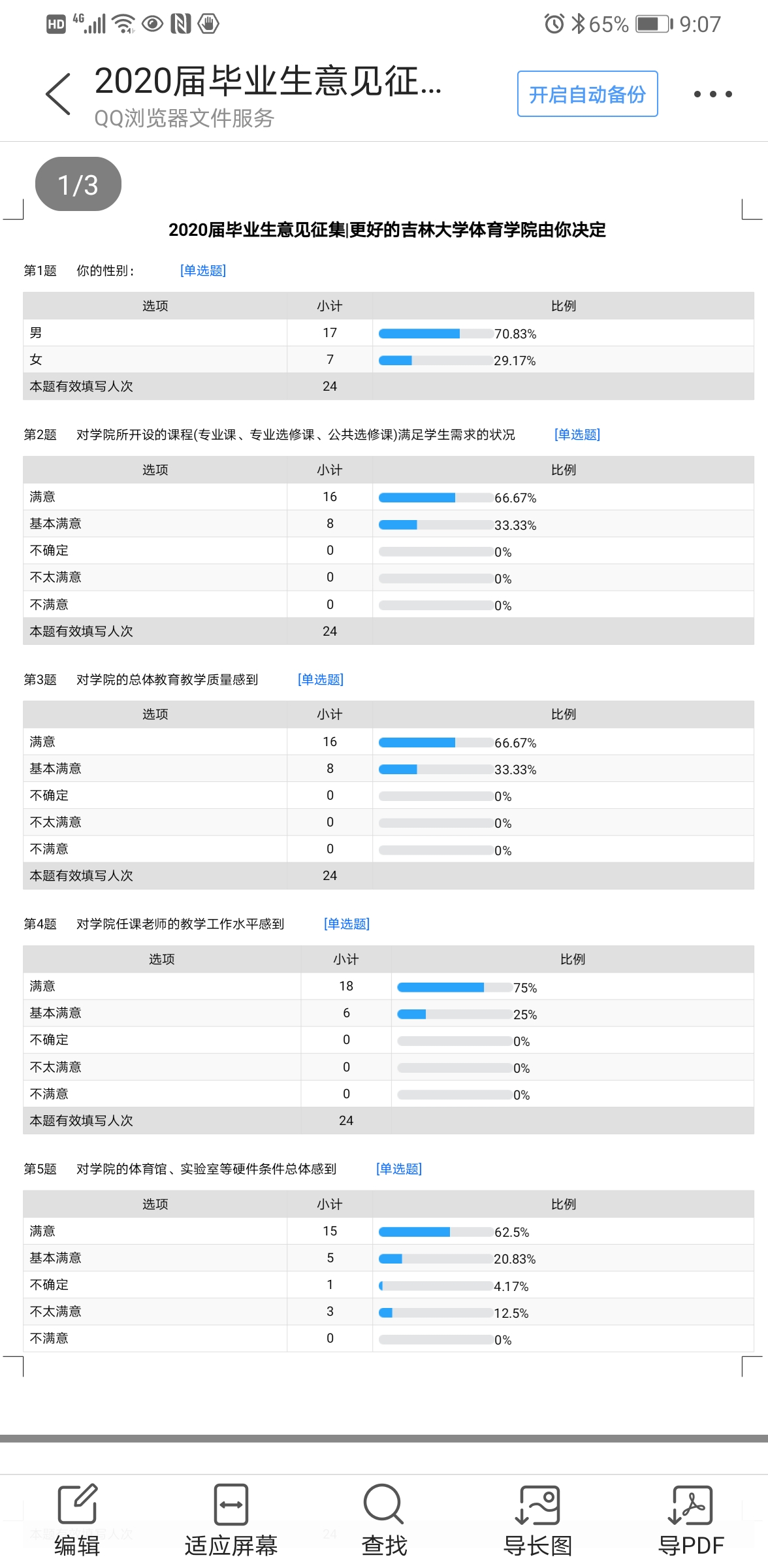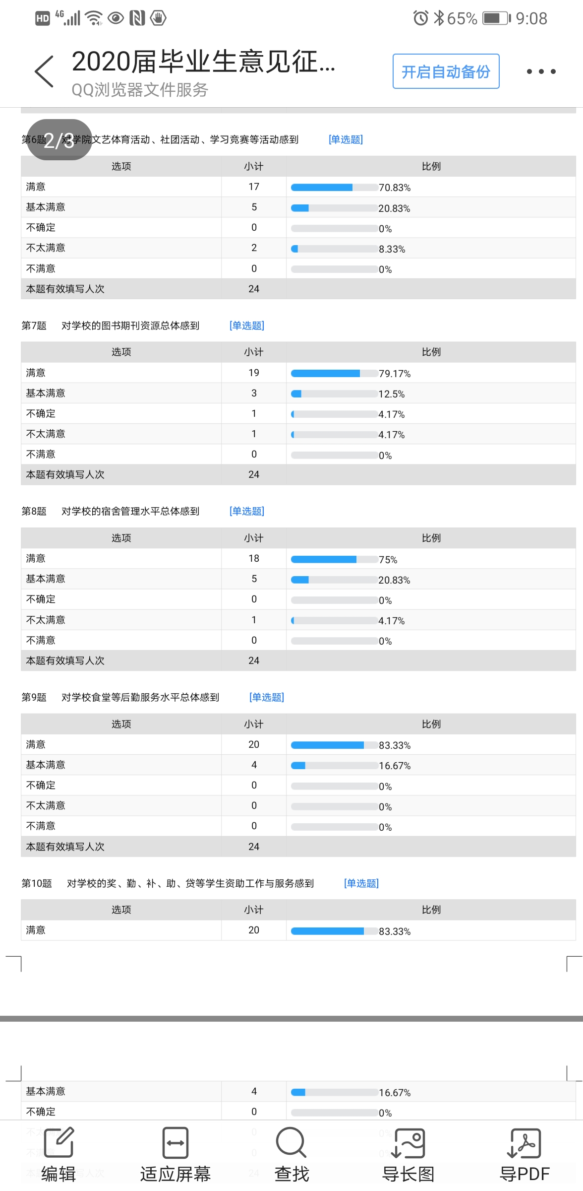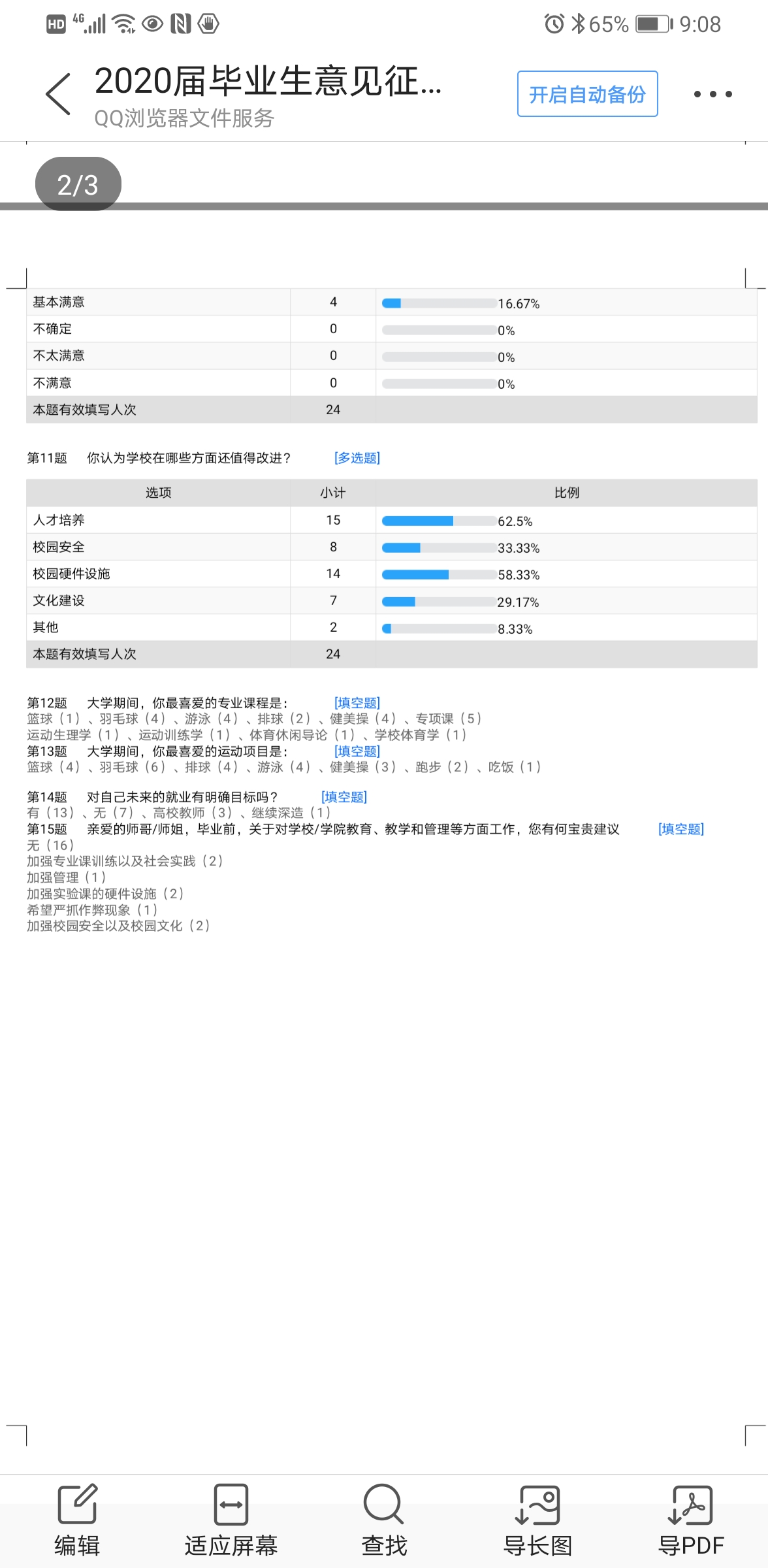学生会在辅导员王祎老师指导下,制作了一份包含15道题的调查问卷,涵盖了对学校发展建设、治校办校方面的意见建议。随后,2020届本科毕业生认真填写了问卷,相关负责人对问卷信息进行了整理和总结。通过对问卷调查结果的统计,学生对学校的硬件设施建设和后勤保障等校园软件服务十分满意,针对学校人才培养和文化建设等方面提出了一些建议。
