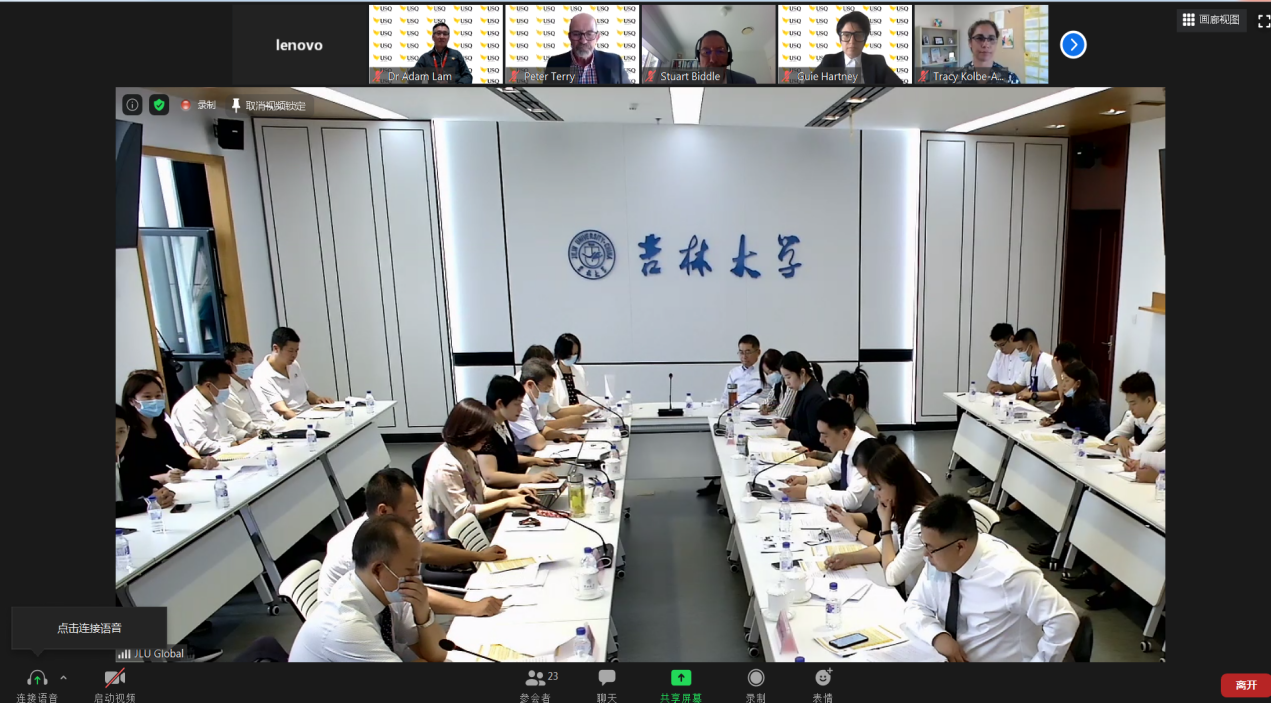At 11 am Beijing time (1 pm Sydney time) on August 31, 2020, the online international exchange and cooperation seminar was successfully heldjointly by the Physical Education College of Jilin University and the University of Southern Queensland in Australia.Main attendees included Zhang Guangcui, Director of the Office of Global Engagement of Jilin University, Professor Peter Terry, Dean of Graduate School of University of Southern Queensland, Professor Qiu Peng, Dean of Physical Education College of Jilin University, and Bai Yin, Deputy Director of the Office of Global Engagement, together with more than 60 audience, including experts and scholars in related fields from both sides, relevant leaders of the International Department of the University of Southern Queensland, members of the relevant leadership team of the Physical Education College of Jilin University, teachers and students. The seminar was co-chaired by Professor Peter Terry and Professor Qiu Peng.